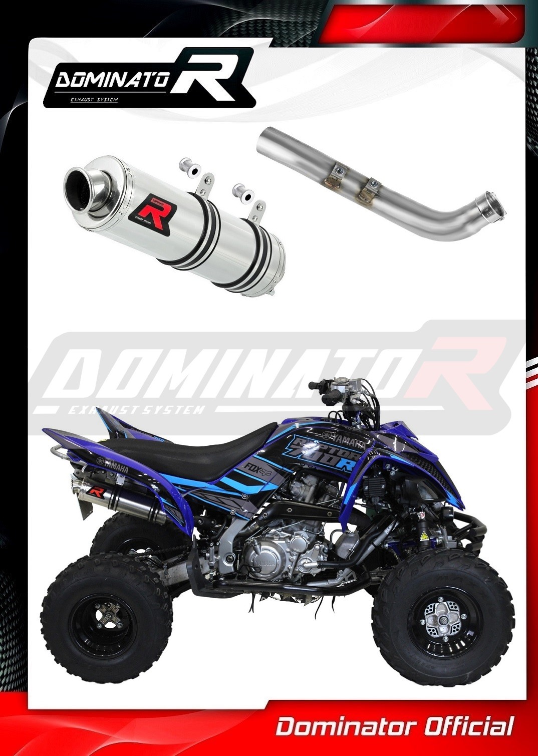 The Dominator Exhaust will change the nature of your quad giving it a unique sound. The Exhaust system will increase the power and torque of the engine, while reducing the weight of the muffler.